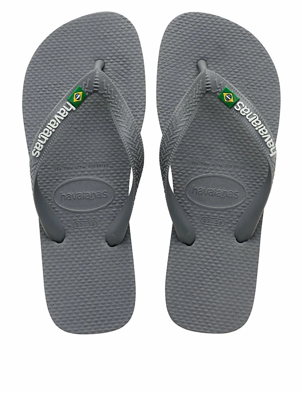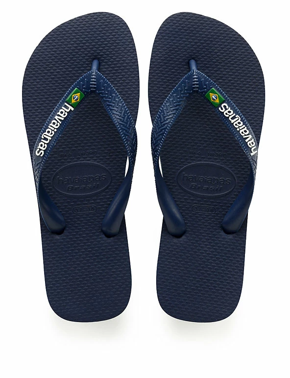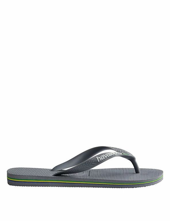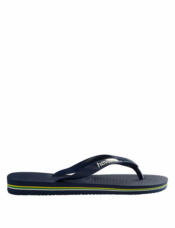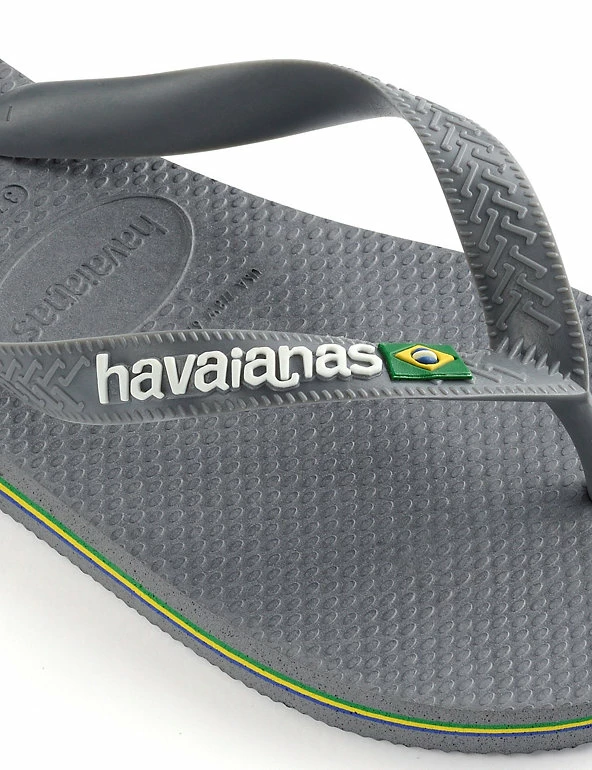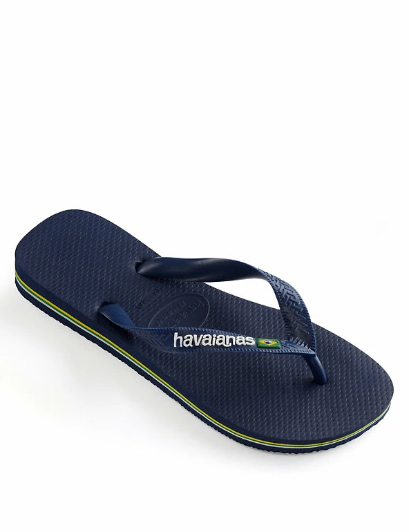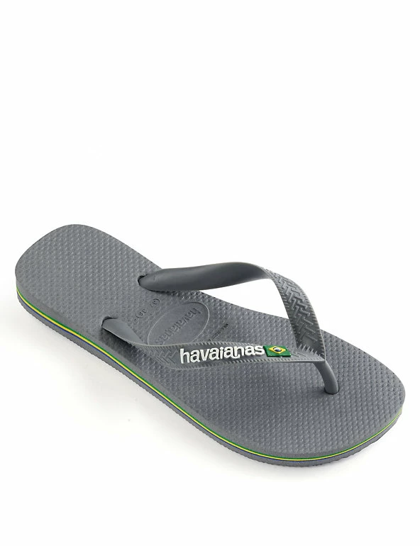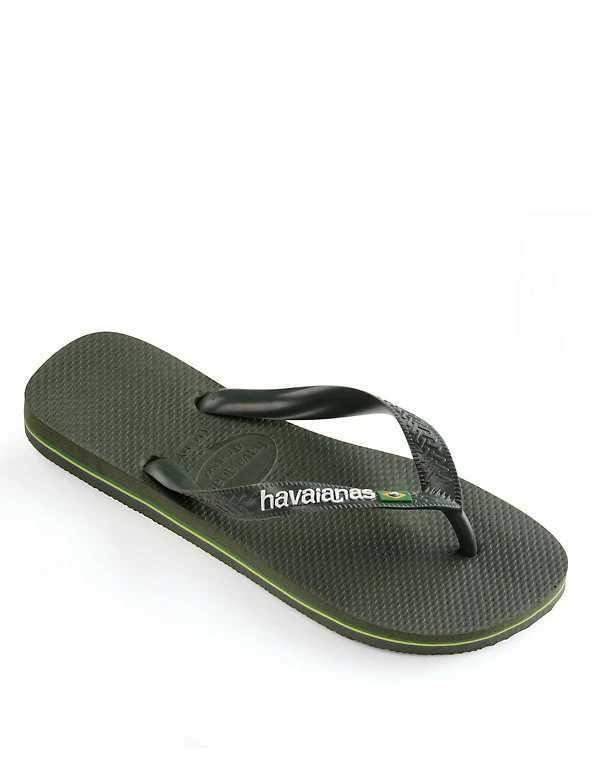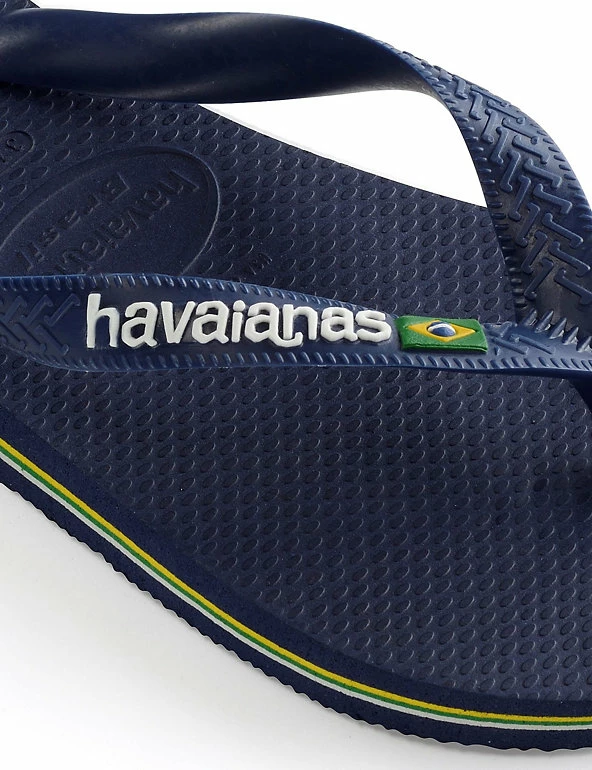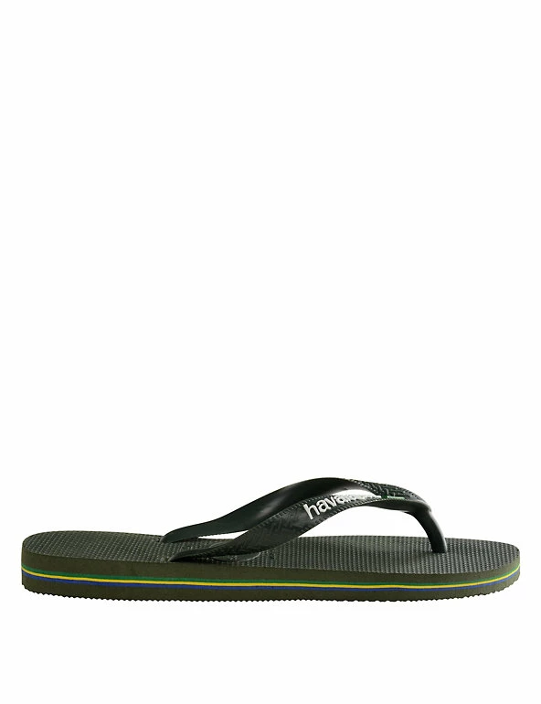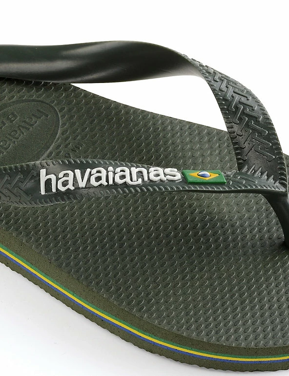 Celebrate the summer in these classic Brazil logo flip-flops from Havaianas. The straps feature the brand name with the Brazilian flag, and the flag’s colours are repeated as striped layers in the soft and grippy pure rubber sole.