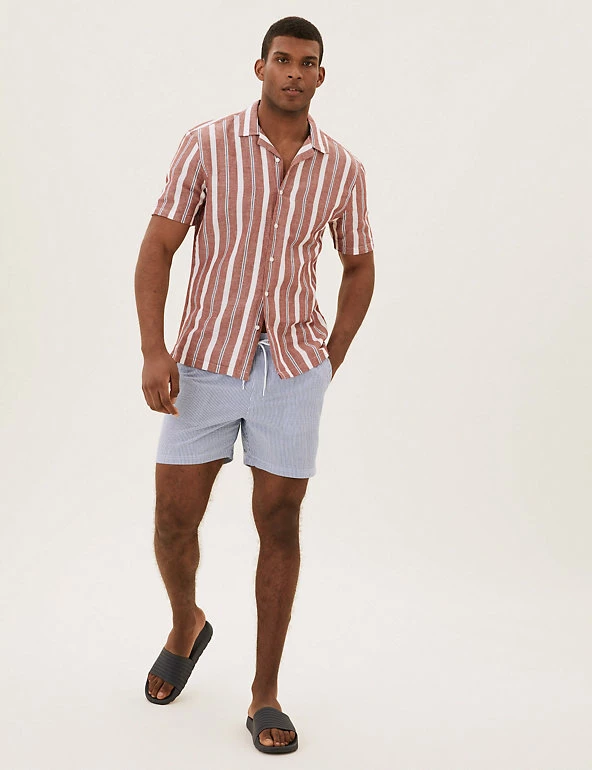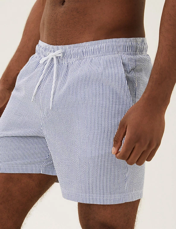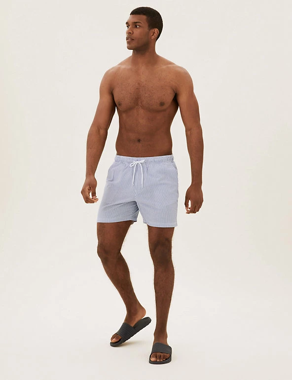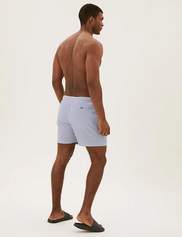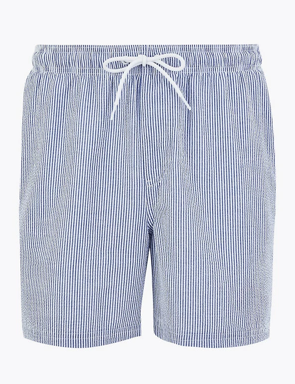 Our striped swim shorts are great for a few laps in the pool or just relaxing in the sunshine. New regular fit sitting just above the waist. Elasticated waistband with drawstring fastening. Above the knee length. Mesh inner and a velcro back pocket. Material is quick drying and has our Sun Smart finish which features 50+ Ultraviolet Protection Factor (UPF). Made with recycled polyester.