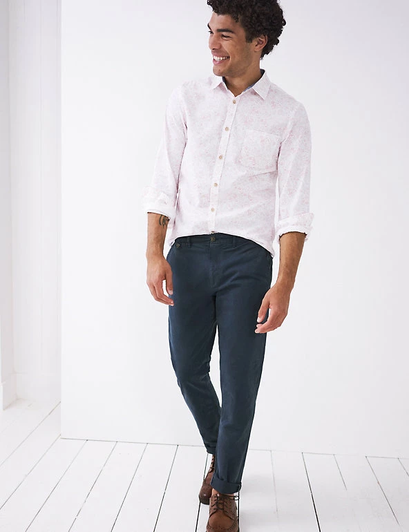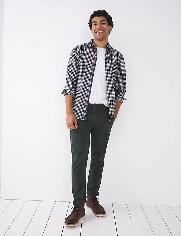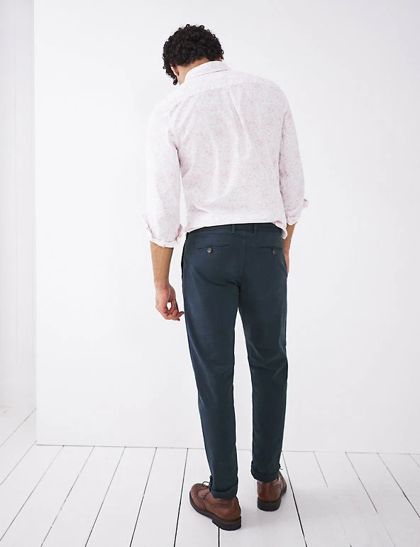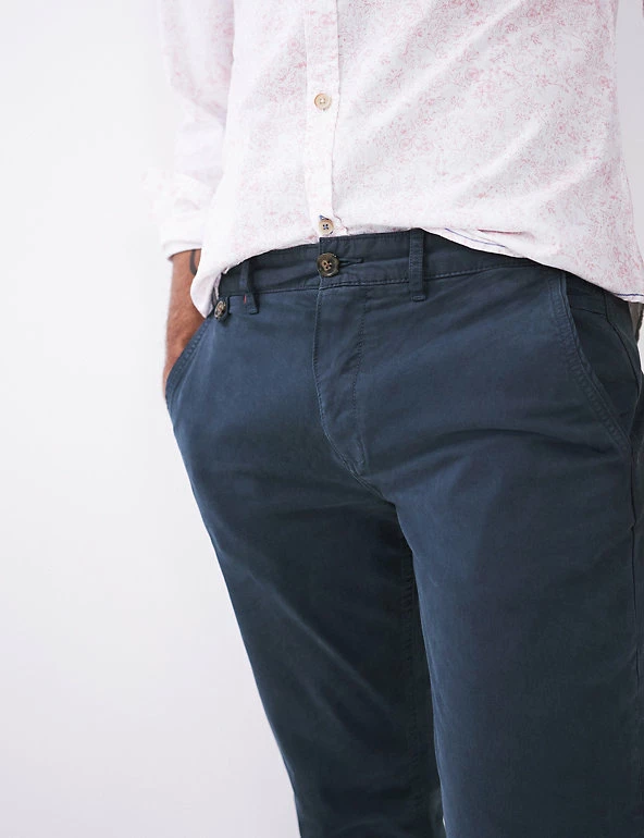 These organic cotton-rich chinos from White Stuff combine comfort with class. The regular-fit design includes two side pockets, plus a small pocket with button detail on the front. They fasten with button and zip fastening and feature the brand’s initials in small embroidery. Made with organic cotton.