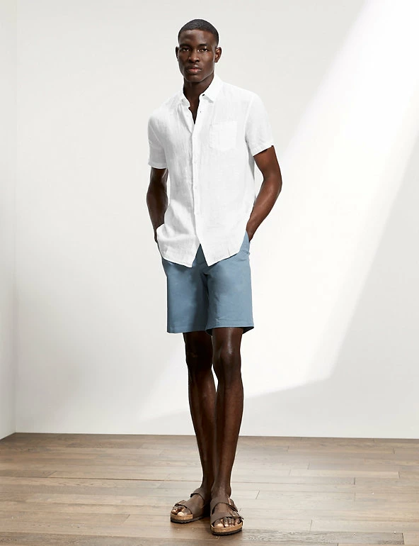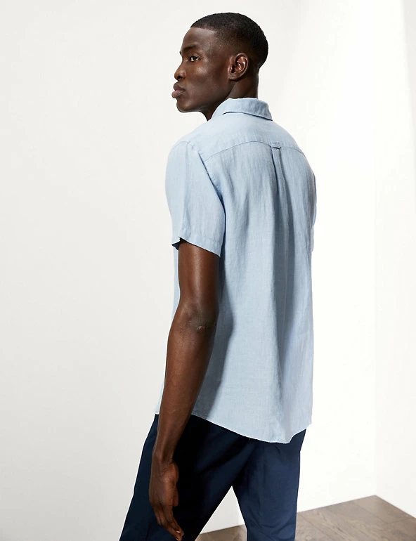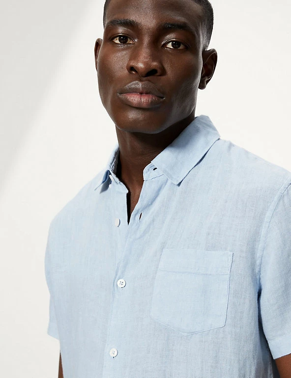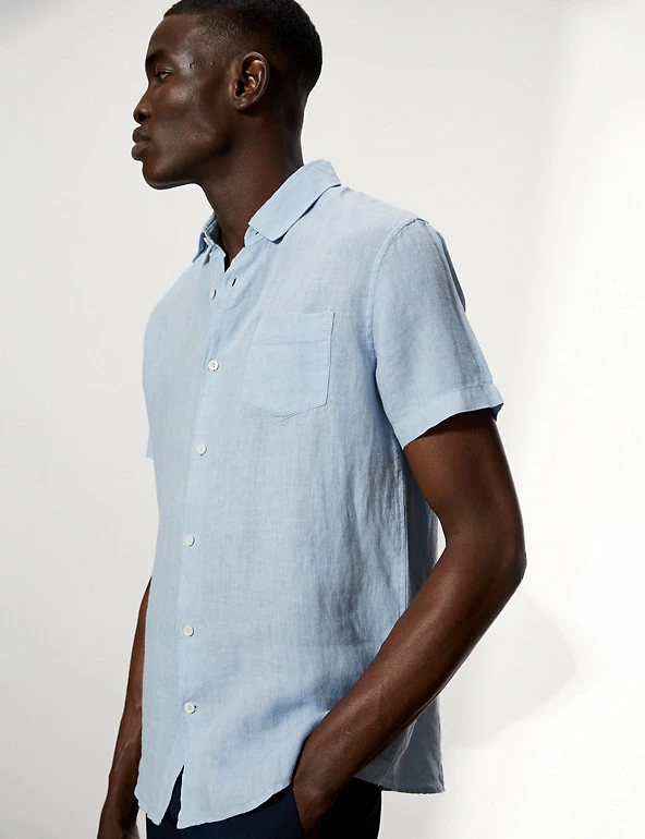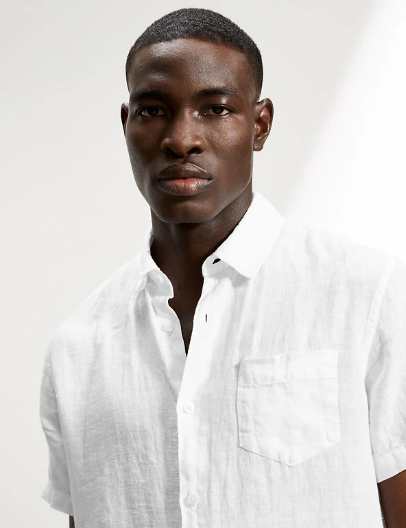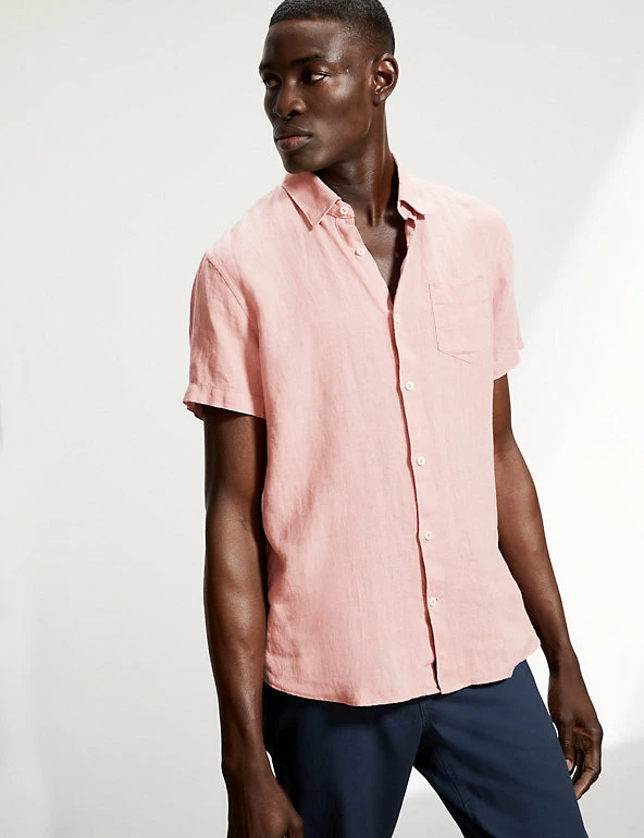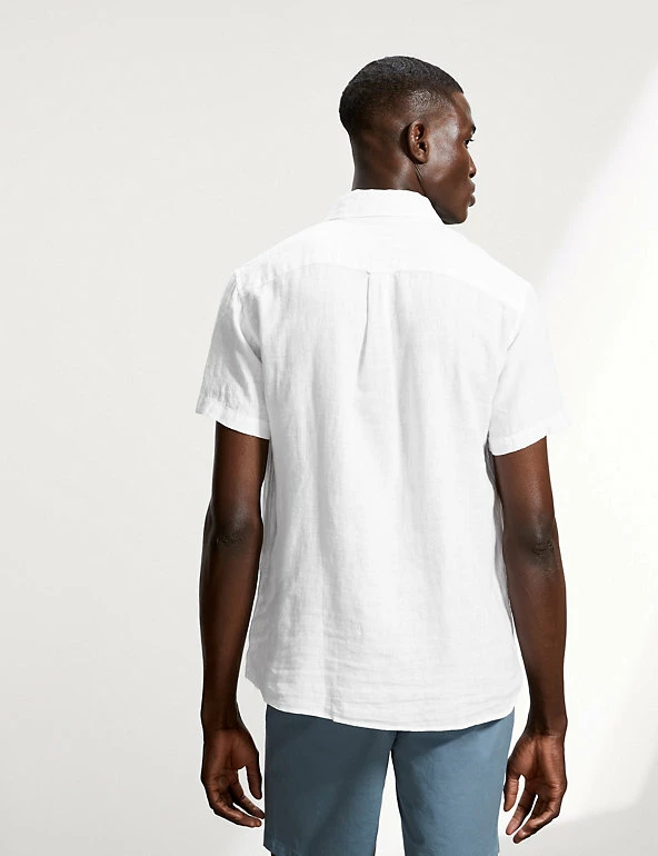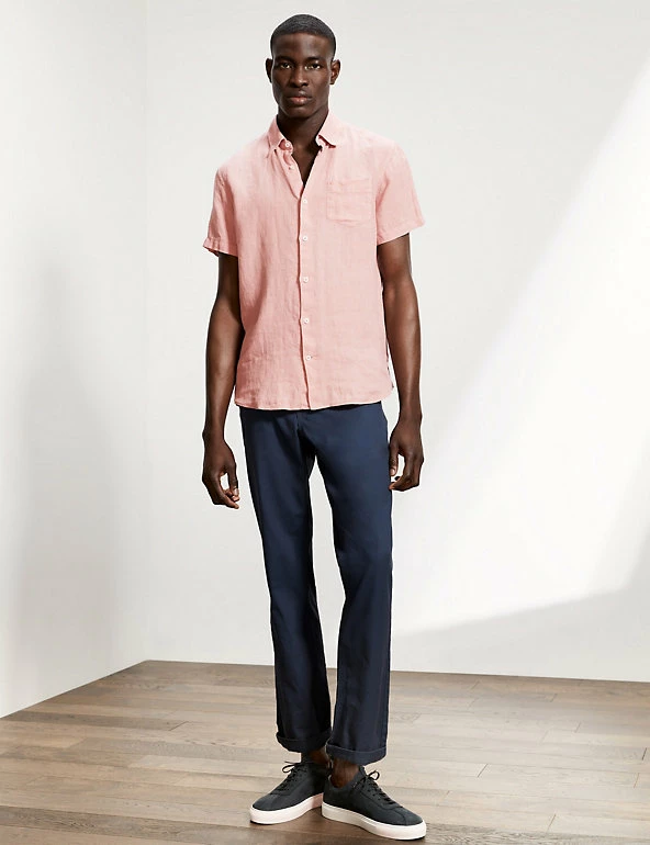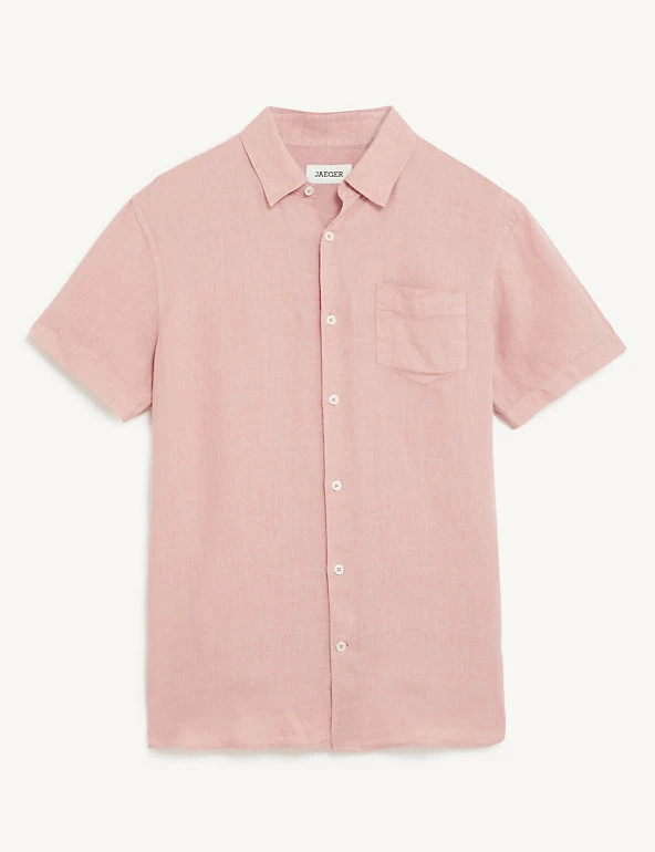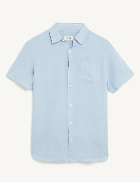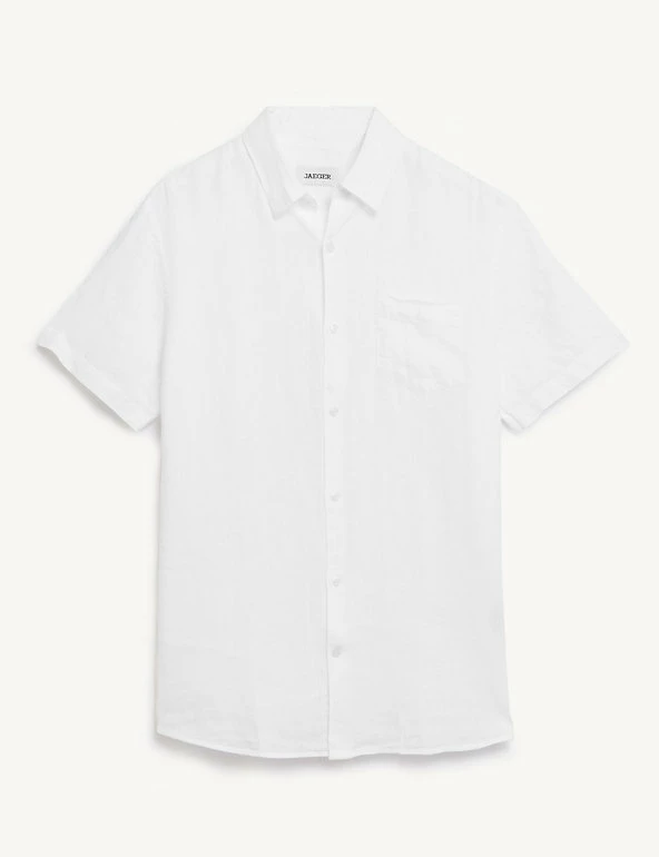 This pure linen shirt from Jaeger will see you through summer trips and events. Cut to a regular fit, this effortless style is crafted from European linen which has been laundered for a luxuriously soft hand-feel. The short sleeves are perfect for warmer weather, and the smart collar has concealed buttons for a fixed shape. This style is finished with a patch pocket and branded button fastenings. Wear it with chinos or shorts for an instant outfit.